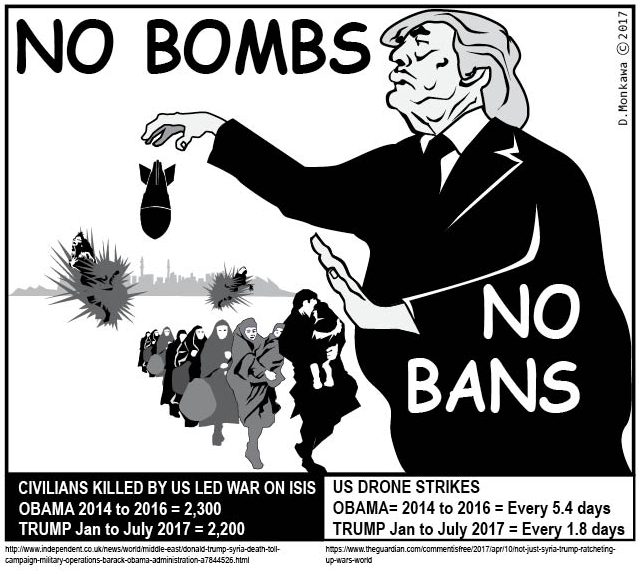 First he bombs them then bans them from coming to the US.